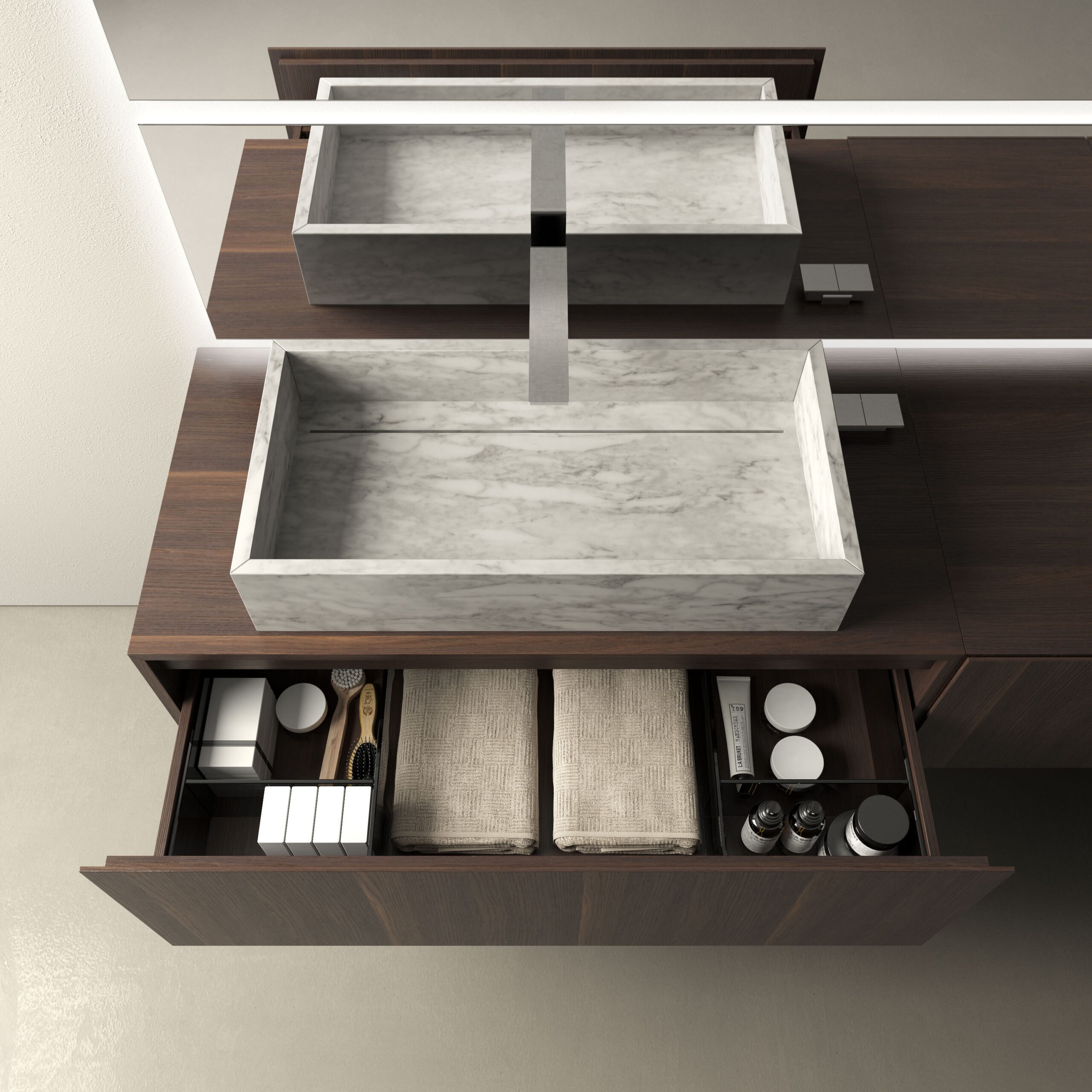 Systemet kan sättas på med en traditionell väggströmbrytare eller med Touch-brytare inbyggd i spegeln.