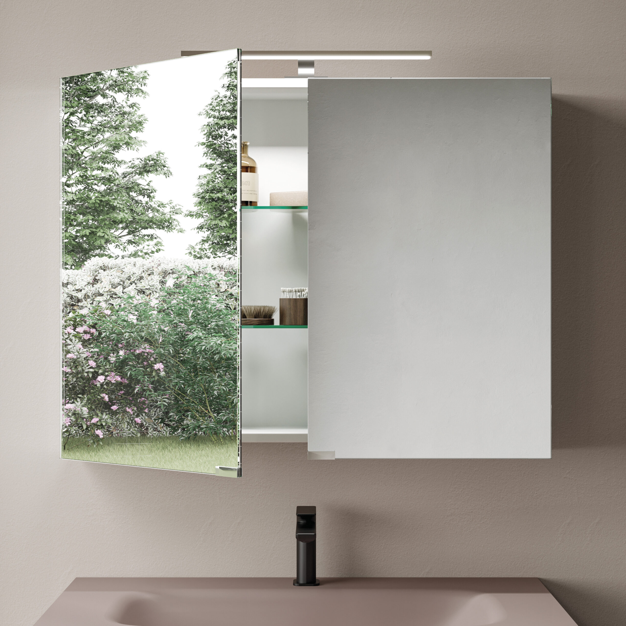 Med dubbelsidiga speglar och speglar på stomsidan. Insidan är med glashyllplan.